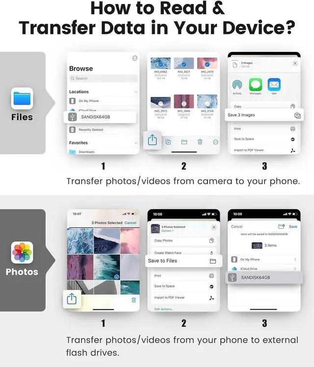 Two-Way TransferThe SAMZHE SD card reader supports two-way transfer plug it into the iPhone's port and using the iOS's Files system was able to see photos from your camera's SD card or download pictures to the card. Plug and play easy to import and export a variety of file types including photos videos music and documents. You Have to Have ThisIf you like to take photos for fun or even if you are a photographer on the go who'd like to view their photos on a iPhone or iPad - possibly even uploading some from the field before you need this! Plug it right into your phone and the photos videos load so quick in your albums and able to save them.