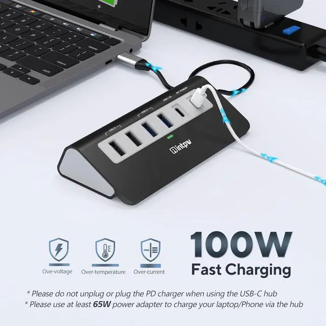 Charging: Using the 100W USB-C PD charging port to charge your Type-C laptop and tablets. For a better experience when you use the usb hub please use at least 65W power supply to charge your laptop via hub. (PD port not support data transfer)
