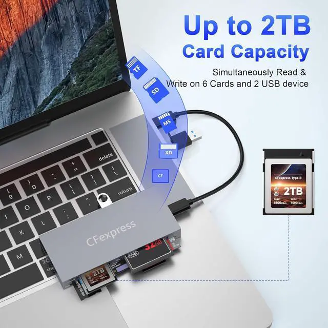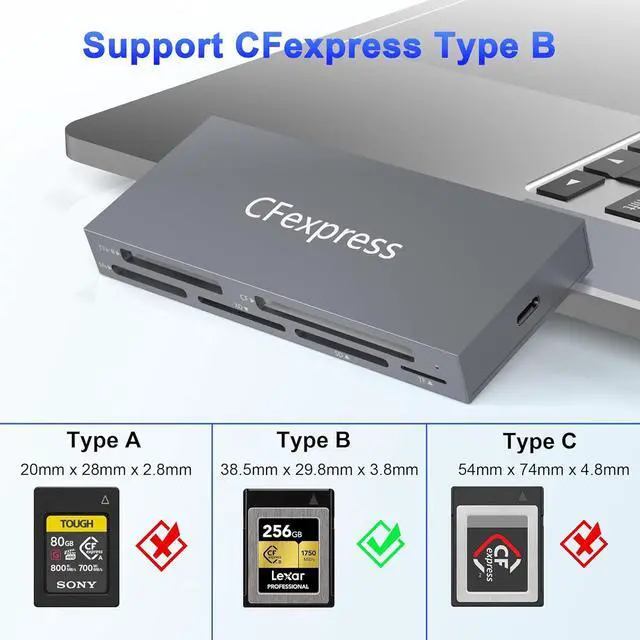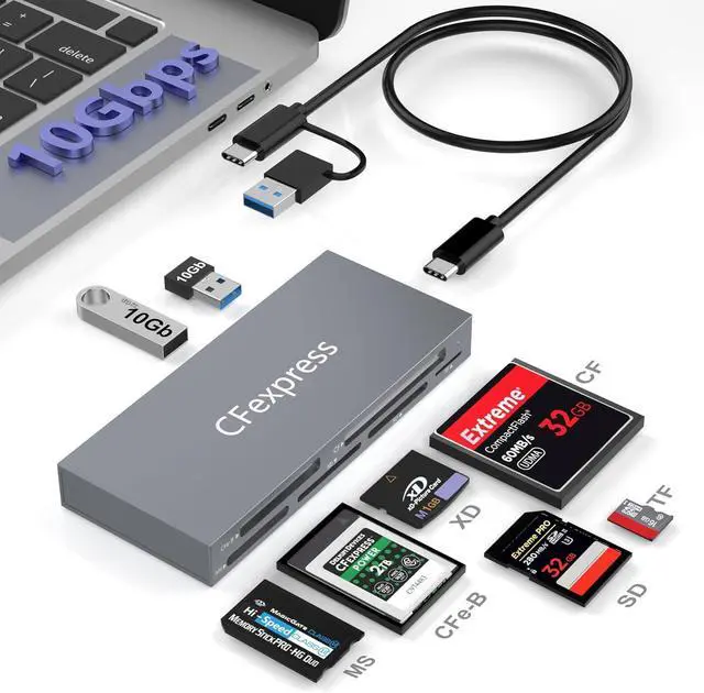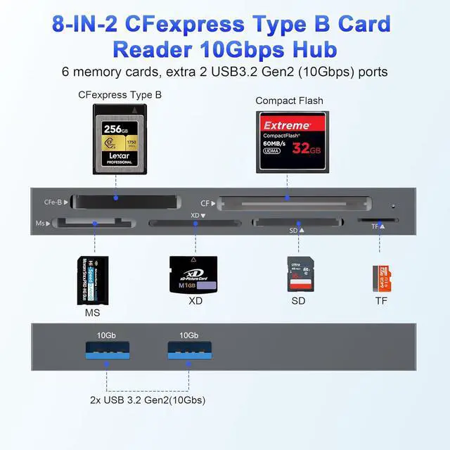 Universal Compatibility: This cf express type b card reader works seamlessly with massive 2TB cards across all slots: CFexpress Type B (up to 2TB) SD/SDHC/SDXC microSD/microSDHC/microSDXC CF I/II MS Pro/MS Pro- Duo/MS Pro-HG and XD (all series incl. Olympus/Fujifilm). Plus connect external HDDs flash drives keyboards etc. via the dual 10Gbps USB ports.