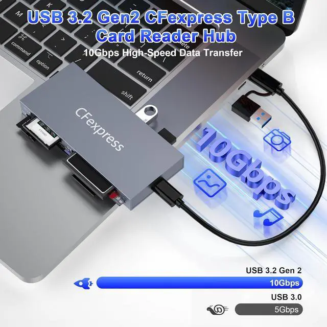 SuperSpeed Data Transfer: USB 3.2 Gen 2 technology delivers blazing-fast speeds up to 10Gbps (1250MB/s). Effortlessly transfer high-res photos 4K/8K videos from your CFexpress Type B and other cards. Backward compatible with USB 3.1 /USB 3.0 /USB 2.0. The Extra 2* USB ports with superspeed up to 10Gbps.