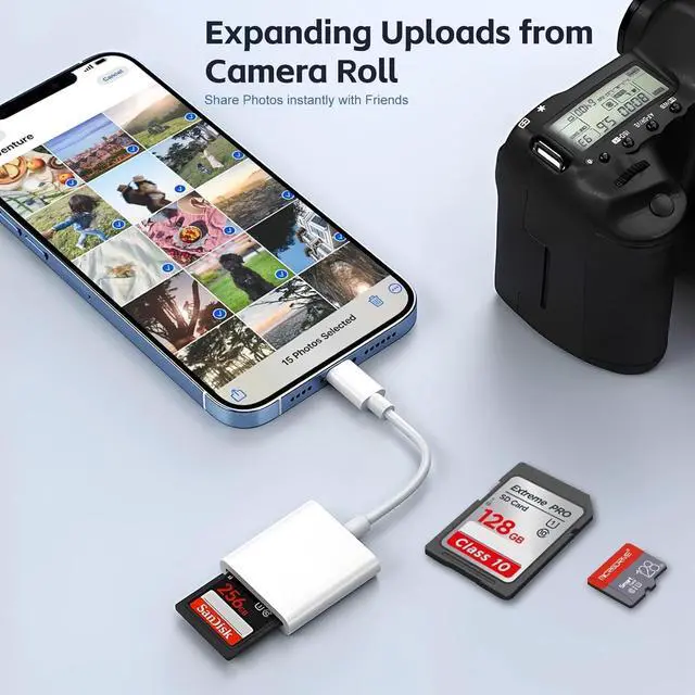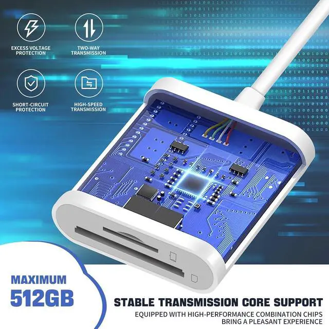 2-in-1 SD Card ReaderThis sd card reader adopts dual card slot design compatible with SD/SDHC/SDXC/MicroSD/MicroSDXC/MicroSDHC memory cards. You can easily save the photos inside the SD card to your iPhone/iPad/Mac/Camera view the photos and videos in the memory card anytime and anywhere and upload them to social platforms it is a good partner for your travelling and playing. Bi-directional TransferThis memory sd card reader supports batch uploading photos and videos to transfer to your iPhone/iPad/Mac/Camera reducing waiting time and also supports you to save the data from your mobile phone or computer to the SD card through the sd card reader.