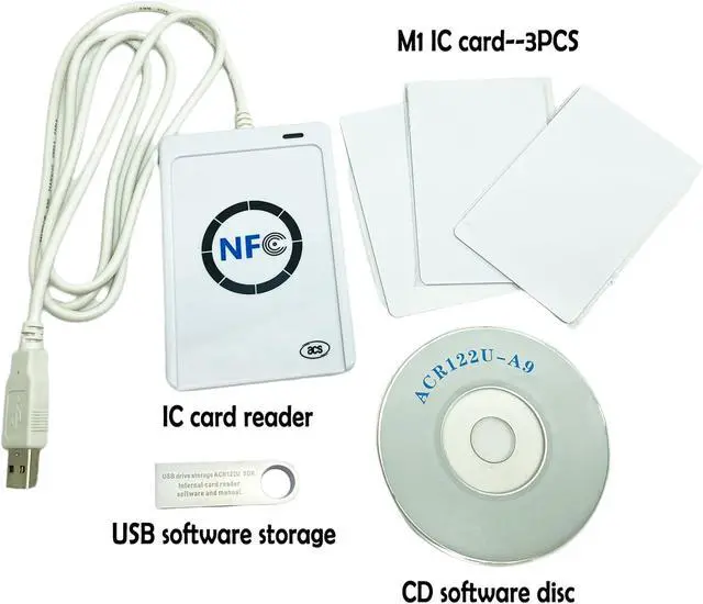 Product content: 1 card reader 1 software CD and 3 test IC cards. The product is compatible with this free software (NFC Tools GUI)