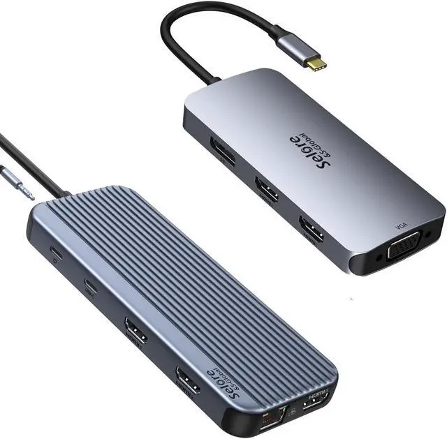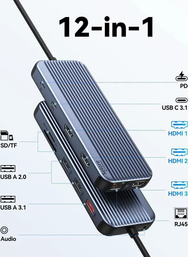 [(12 IN 1 Laptop Docking Station)] Selore docking station for laptop easily expand 1 usb c/thunderbolt port into 12 different Ports: 3x4K HDMI, 2xUSB 3.1,2xUSB 2.0, SD/TF Card Reader