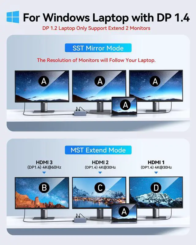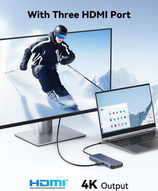 [(4k Docking Station 3 Monitors)] 12 in 1 Triple Display Docking Station allows you outputting triple 4k display. WINDOWS mirror mode:All HDMI output resolution will follow your laptop, WINDOWS extend mode:HDMI 1 4k/60hz,HDMI 2 4K/30hz,HDMI 3 4K/30hz.MAC OS:M1 and M2 Chip:All HDMI output are 4K/60hz,others are 4K/30hz.(All of the above resolution is based on DP1.4 laptop and monitor)