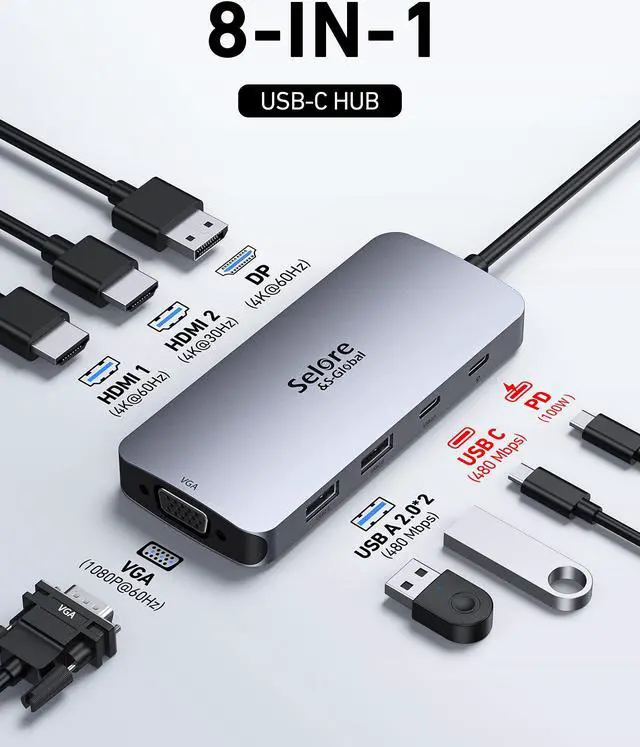 [(USB C Docking Station3 HDMI Ports)] Selore USB C Docking Station Dual Monitor equiped with 3 4K HDMI,USB C 3.1,USB A 3.1,2xUSB 2.0, SD/TF Card Reader, Gigabit Ethernet, Audio&Mic and 100W PD Charging. Easily expand your type c or thunderbolt ports to 12 different Ports.Plug and play, no need to install any driver or software! With this laptop docking station,you will get most port you might will use in work and life.