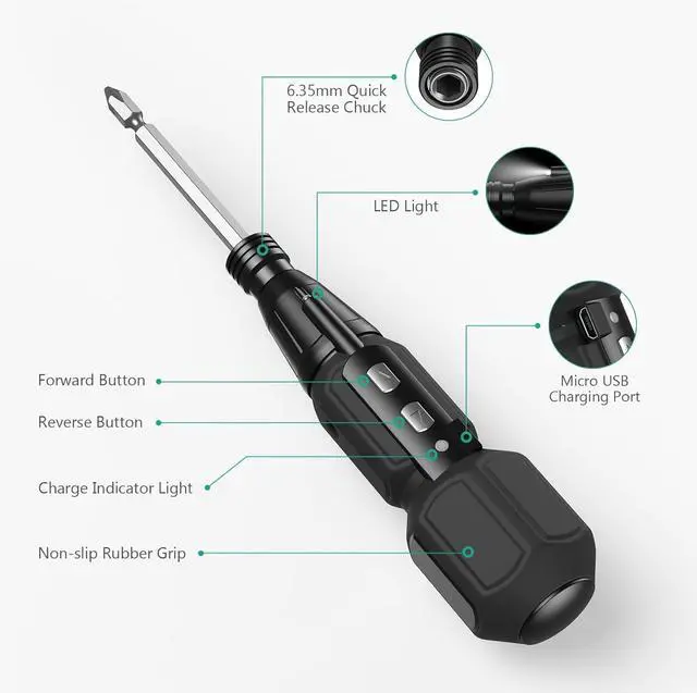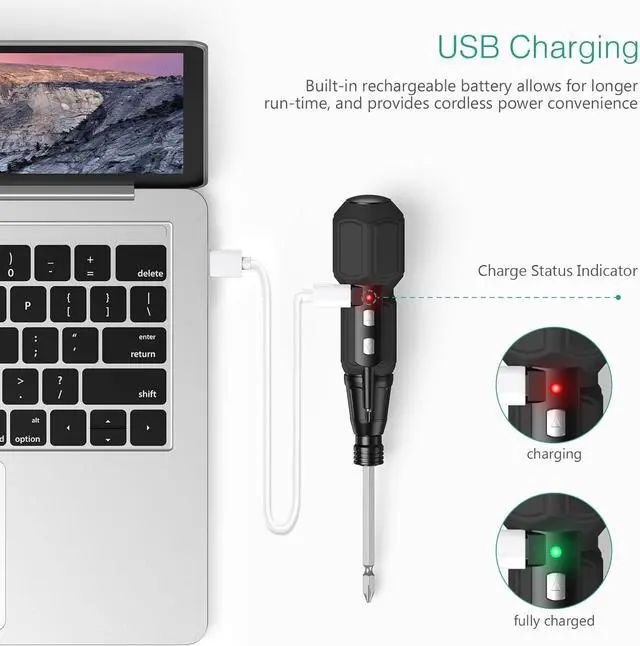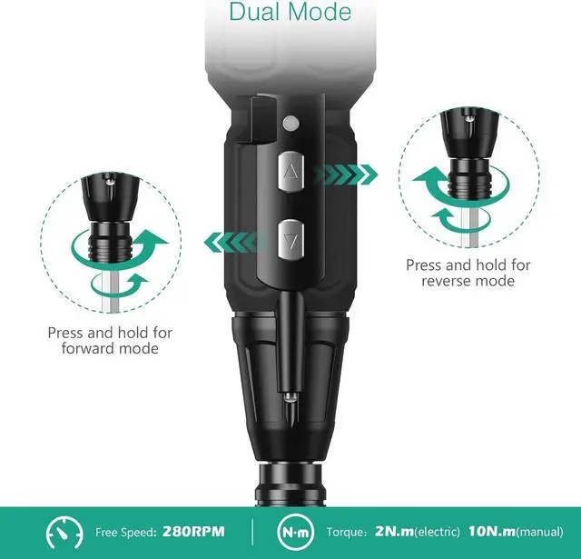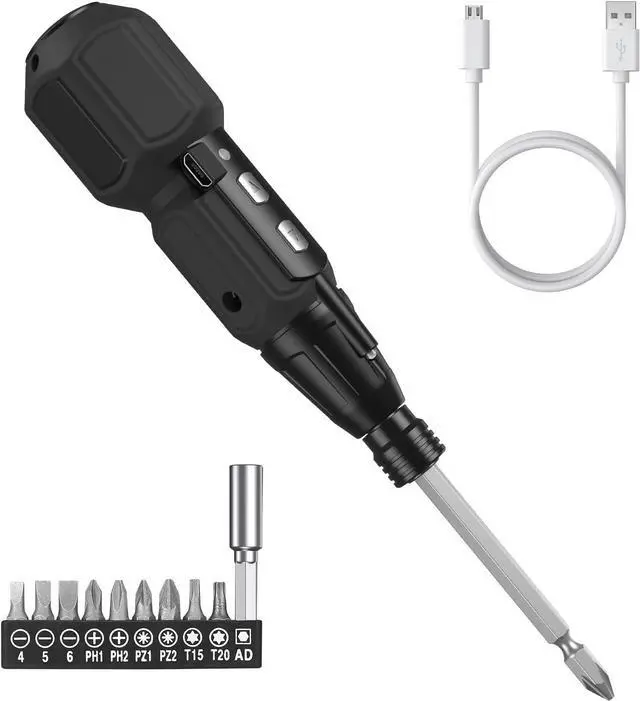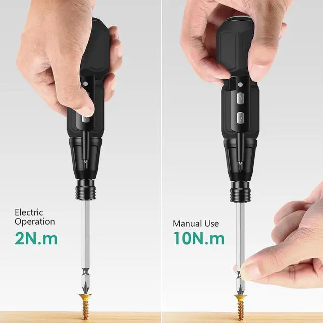 Electric & Manual 2-in-1The idling speed of the cordless electric screwdriver is 280rpm the maximum torque in the electric mode is 2N. m and the maximum torque in the manual mode is 10N. M. It is extremely outstanding in the mini electric screwdriver set. Multi -commonly Used BitsThe details of bits are as follows: 1 x 100mm double-ended long bit Flathead 4.0 Flathead 5.0 Flathead 6.0 PH1 PH2 PZ1 PZ2 T15 T20. Suitable for handicraft DIY computer assembly and furniture maintenance. USB Charging & Charging IndicatorBuilt -in rechargeable battery comes with a USB charging cable can work continuously for 40 minutes after charging for 1 hour. Red light is on during charging green light is on after fully charged. Built -in LED LightThe built -in LED working light will be automatically turned on during work to illuminate the dark area of the corner to help you work efficiently. Heartwarming ReminderTo prolong the life of your screwdriver and bits wipe them with a clean cloth after use and do not immerse them in water.