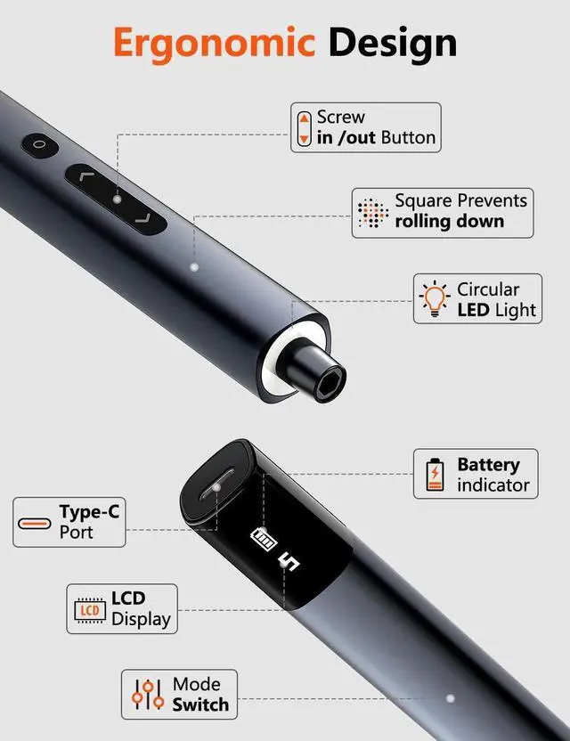 With a robust 200 RPM motor even tough jobs become effortless. The USB-C charging cable ensures quick and easy recharging so you're always ready for your next project. 50-in-1 Magnetic BitsEquipped 40 precision bits with hardness up to 60HRC which are resilient and durable. With 1*Spudger 1*Metal Pry Bar 1*Pointed Tweezers 1*metal pry bar 1*Opening tools 1*Type-C USB Cable 5*Opening Picks. This power screwdriver covers all major screw types including Phillips Torx Triwing Hex Pentalobe and Triangle making it a must-have for tech repairs and DIY enthusiasts. A perfect gift for gadget lovers! Push Pop-up Design & Ergonomic With the latest square anti-roll design and ultra-light body.