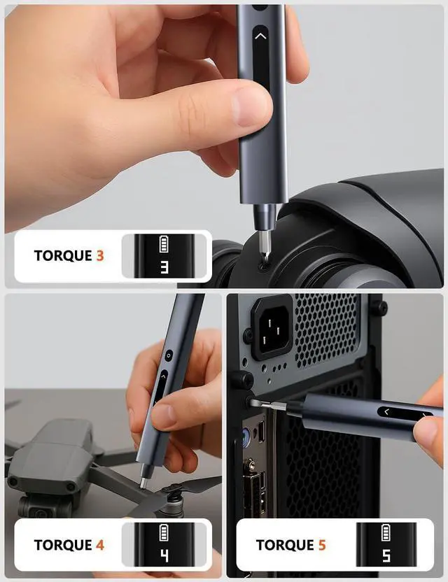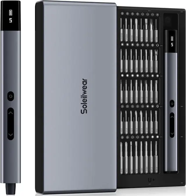Latest 5 Torque Upgrade & More Powerful The Soleilwear mini electric screwdriver features 5 adjustable torque levels** ( 0.15 - 0.75N. m) giving you precise control to handle various tasks. The manual torque of 7N. m provides extra power for manual screwdriving when needed. Designed for stability and ease of use this electric screwdriver cordless is perfect for laptops smartphones MacBooks toys drones keyboards glasses watches and most other electronic devices. Save time and effort with a tool built for convenience and efficiency. Rechargeable & Long-Lasting Battery Powered by a high-capacity 500mAh rechargeable battery this screwdriver set can handle over 600 screws on a single charge.