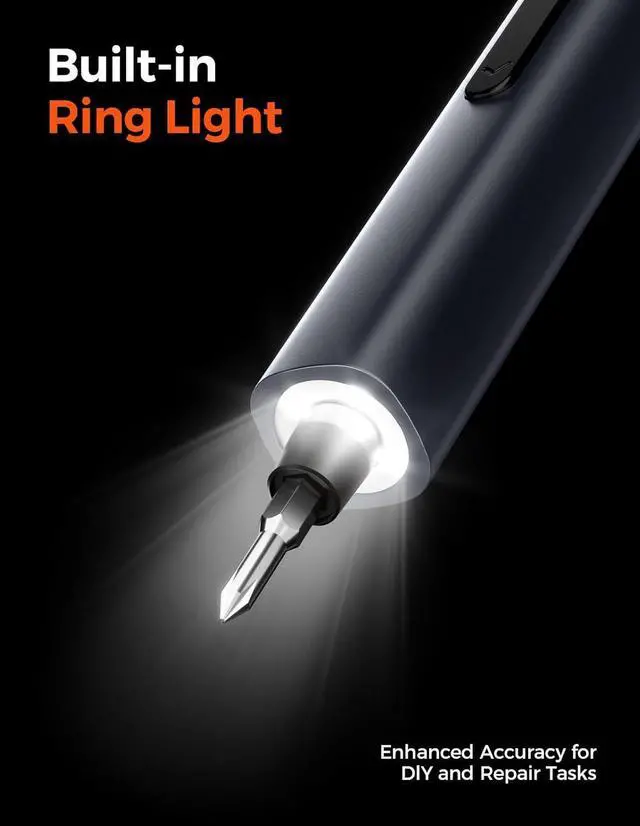 Simply press to eject the box for quick one-handed operation improving efficiency. Crafted for comfort this electric precision screwdriver features a non-slip grip and an ultra-lightweight body reducing hand fatigue during extended use. Its compact design allows easy access to tight spaces making it a user-friendly tool for professionals and DIYers alike. LED Light & Dual Rotation Modes Built-in LED light enhances visibility in dim workspaces ensuring precision. With forward and reverse rotation modes switching between tightening and loosening screws is seamless making every task more efficient.