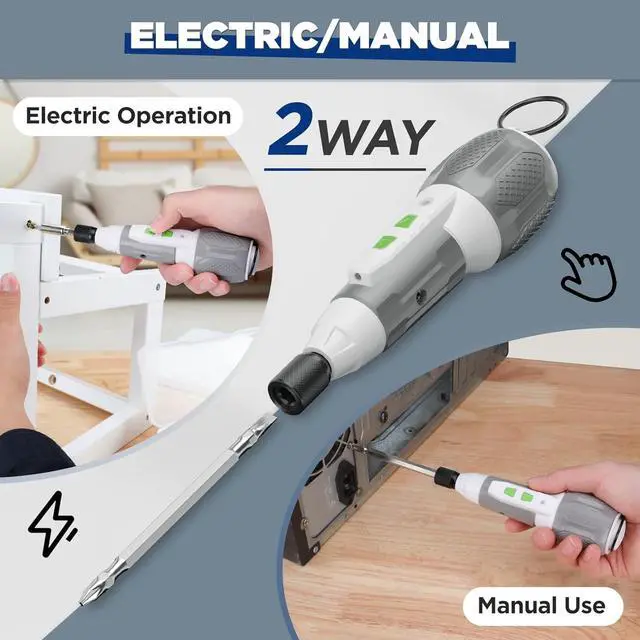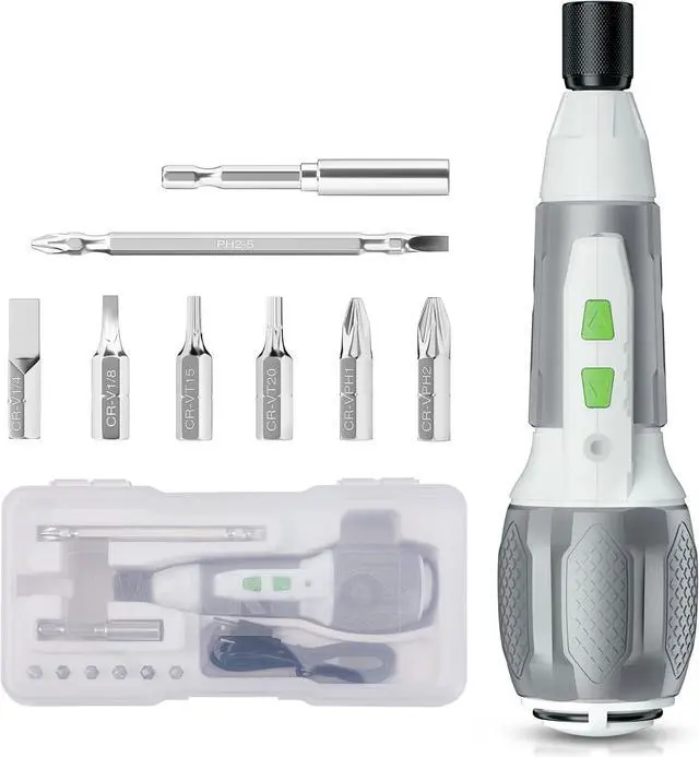 Efficient Performance - The electric screwdriver comes with a high-quality motor that can deliver max torque and speed offering efficient performance to make everyday household repairs easier. With a keyless chuck designed for quick replacement bitsCompact Model Design - Compact body and lightweight only 0.4 lb make the small cordless screwdriver fit one hand to use and tight spaces. The electric screwdriver surface is made of high-quality material to ensure a comfortable grip. Bright front LED light provides illumination for work in dark environmentsUSB-C Charge Convenient - Cordless screwdriver has a built-in long-lasting lithium-ion battery which supports long-term work.