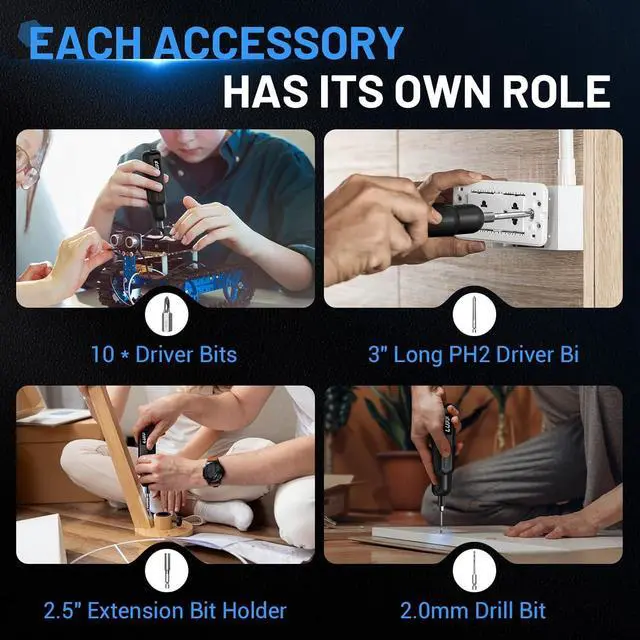 Harden shark strong magnetic chuck to firmly lock the bit. Ensure efficient operation without any crisis. All the details are designed from the buyer's experience thinking about what you want. Accessories Selection Just to AssistingUnderstand the common usage habits focus on most screw types then select effective aids. The screwdriver set electric includes 1* Matte black power screwdriver cordless rechargeable 10* driver bits 1*3 long PH2 driver bit 1* 2.5 Extension bit holder 1* 2.0 mm drill bit 1*bit bar 1*USB Type-C data cable 1*Instruction manual.