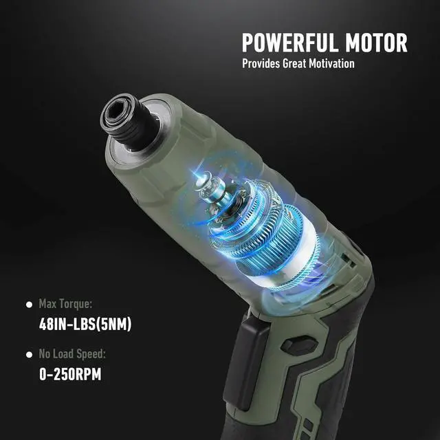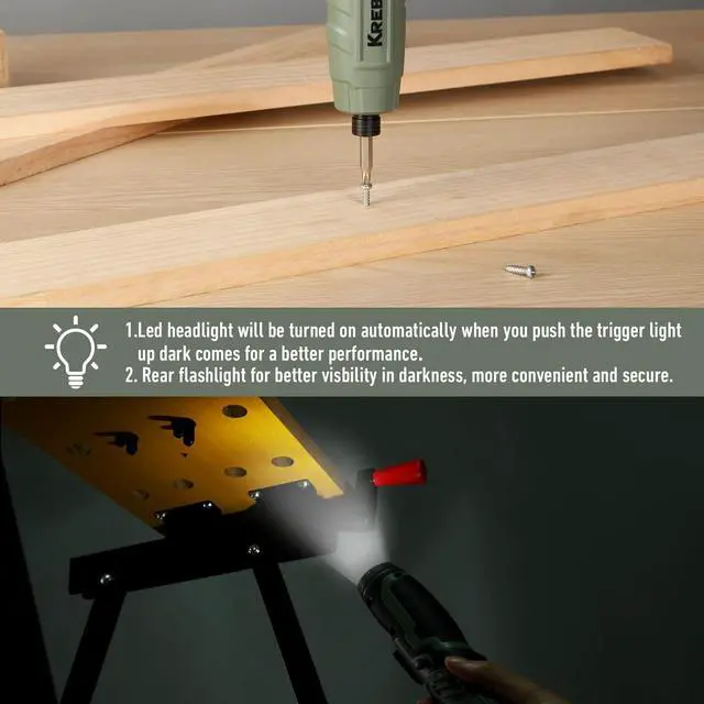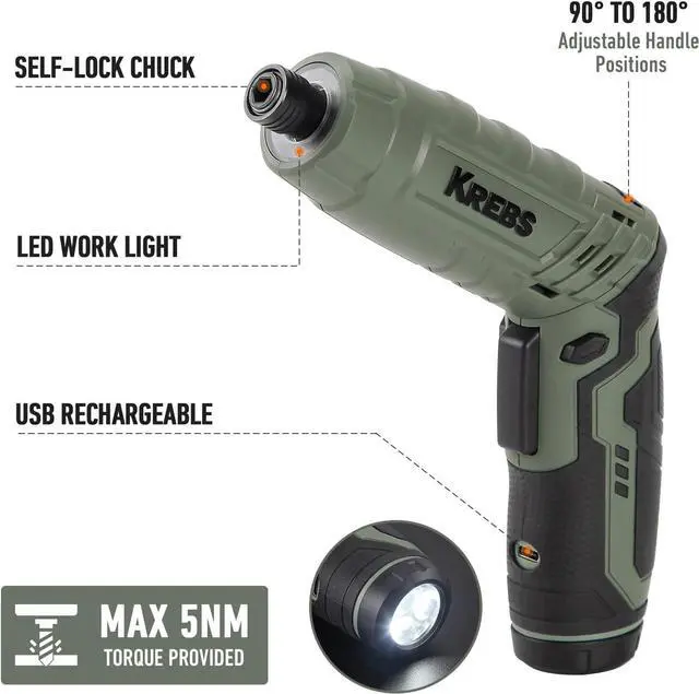 Powerful Motor & Max 5Nm TorqueKrebs cordless screwdriver comes with powerful motor which can deliver higher 45 in. lbs(5N·m) No load speed 250 RPM offer you an efficient fastening performance or light drillingRechargeable 1300mAh BatteryEquipped with built-in 1300mAH rechargeable lithium-ion battery this electric screwdriver With a USB-C cable provided you can charge your screwdriver anytime and anywhereRich Accessories & LightweightThe complete 35 piece screw driver accessories have everything you need to tackle jobs around the house weighing only 0.77I b makes it easy to operate with one hand to useErgonomic 2-Position Handle & LED Light Krebs electric screwdriver has a dual position handle that converts from straight to pistol grip LED Light provides automatic illumination for accurate work in dark environmentGift 39-Pieces Accessories & Portable CaseWhat You Get: 1 x KREBS 4V cordless screwdriver; 28x Screwdriver bits; 3x HSS Drill bits; 1x Screw bit holder; 1 x USB Type-C charging cable; 1 x user manual; 1 x storage bag