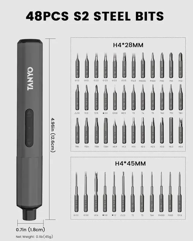 SMALL BUT POWERFUL: You can master 2 torques With TANYO mini electric screwdriver 0.3 N-m in electric mode and up to 3.5 N-m in manual mode. The precision cordless screwdriver delivers a consistent torque output for all of your needs including PCs computers laptops mobile phones Macbooks RC cars drones keyboards PS4s PS5s and other electronic devices.