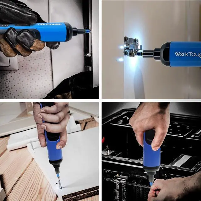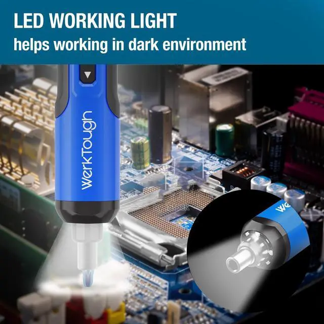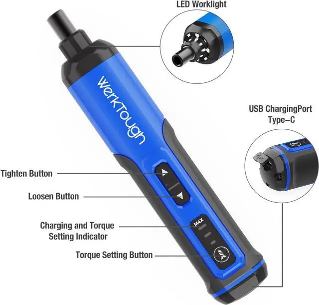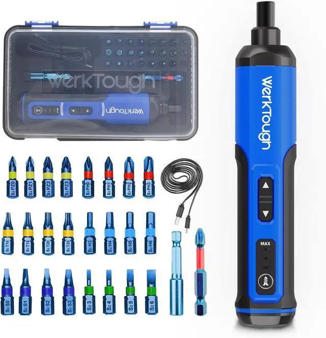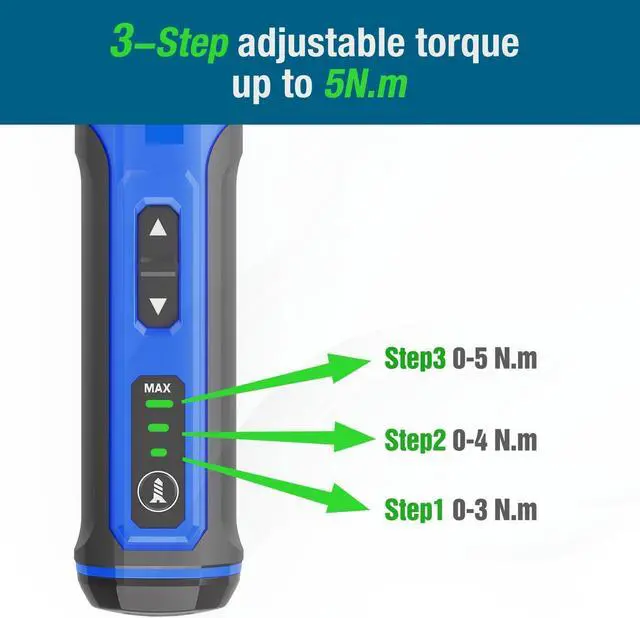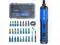 Easy-handling slim body but have 5Nm Max torque and 3-gear step adjustable with LED light. Plus 24pcs 25mm screwdriver bits & 1pcs 50mm screwdriver bits with top quality material S2 colored with decent deluxe blue and with color ring on each bits to clearify different bits. group. All in a nice looking gift box would be perfect choice for home DIY working and a good present gift as well. 4v cordless screwdriver with high quality Lion battery 2000MA with USB cable. Max Torque 5Nm and 3 step torque adjustanle LED lightHigh speed 300rpm which mean good efficiency.