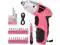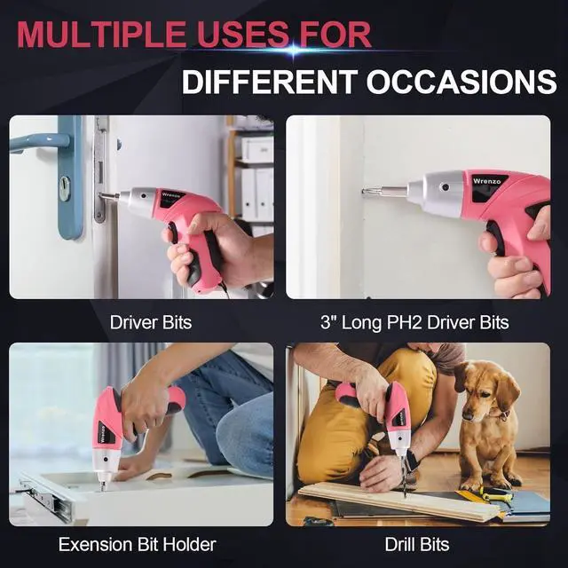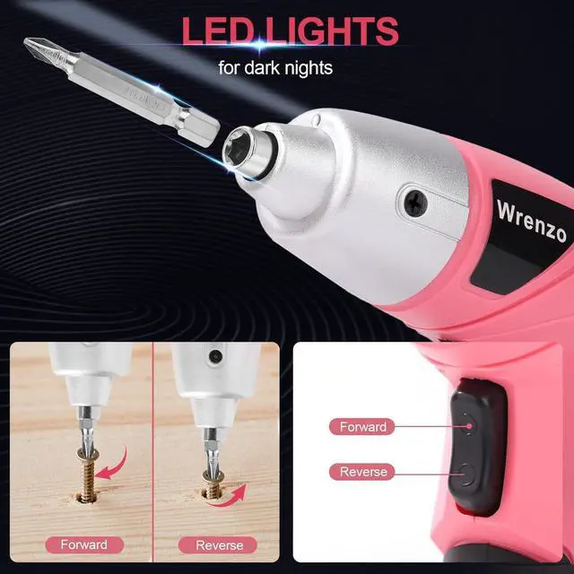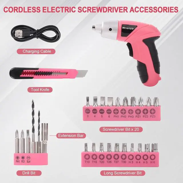 Power Screwdriver Set: Streamline DIY projects with Wrenzos Tool001 electric screwdriver; designed for screwdriving tasks in a vibrant pink finish. Includes 26 bits for versatility ideal for home or office use (not suitable for drilling).
