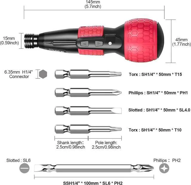 Easy to load/unload: just twist the ring insert the bit and release. Complete Kit & Friendly to Women Includes 1 screwdriver handle 5 electroplated S2 bits (Torx/Phillips/Slotted) 1 USB-C cable 1 storage box and 1 manual everything you need to start your DIY projects! Lightweight (only X lbs) and easy to carry its perfect for women beginners or anyone who wants a hassle-free tool. Great for assembling furniture repairing toys or hanging photos!