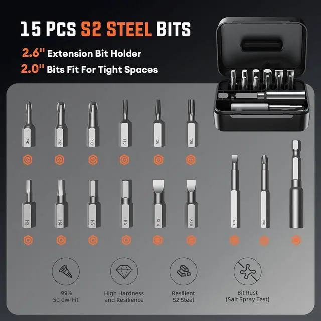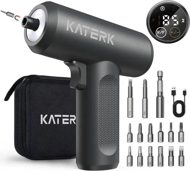 Unlike basic cordless screwdrivers Katerks smart display keeps you informed and efficient. No more guessingjust focus on your project with clarity and confidence. Truly Cordless with Portable Carry Case Freedom to work anywhere. This electric screwdriver set includes a compact bag for easy storage and mobility. No outlets no tangled cords no missing bits. Perfect for on-the-go repairs and organized usability whenever inspiration strikes. Built-in LED Light & 15-Piece Accessory Kit Work clearly even in dark spaces. Our screw gun features an LED light to illuminate your workspace. The kit includes 15 bits plus 2.6 extension bar and 2.0 slim shaft for hard-to-reach areas.