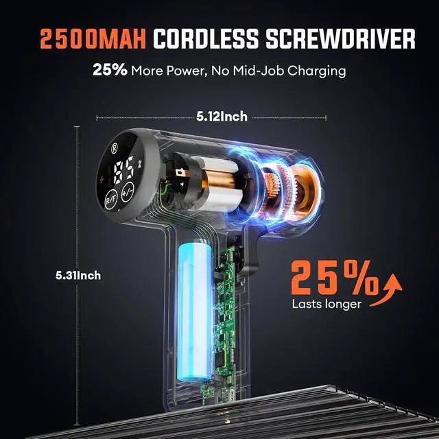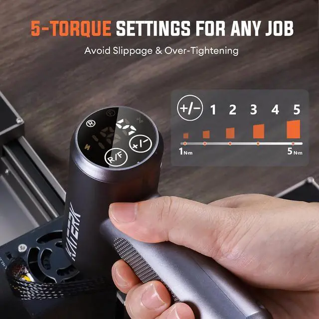 5 Adjustable Torque Settings Up to 5N·m Say goodbye to stripped screws! Unlike single-torque electric screw drivers our power screwdriver offers 5 precise torque levels. Match the force to your task and protect your materials. Avoid extra costs and time spent fixing damaged screws. 25% More Runtime 2500mAh large-capacity battery delivers 25% longer runtime than average electric screwdriver sets. Never stop mid-projectKaterks cordless screwdriver is always ready. No more manual tightening when power runs low. Work smarter faster and without interruption. Intuitive LCD Touch Screen for Total Control Monitor battery life torque level and rotation direction in real time.