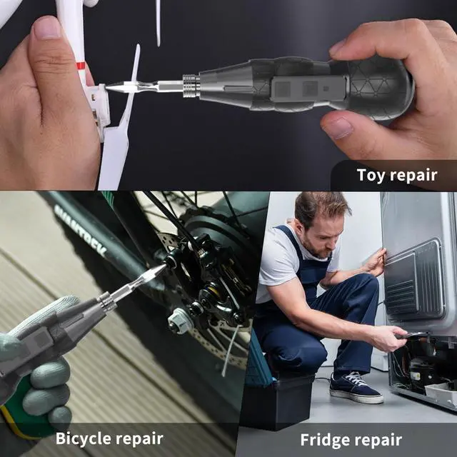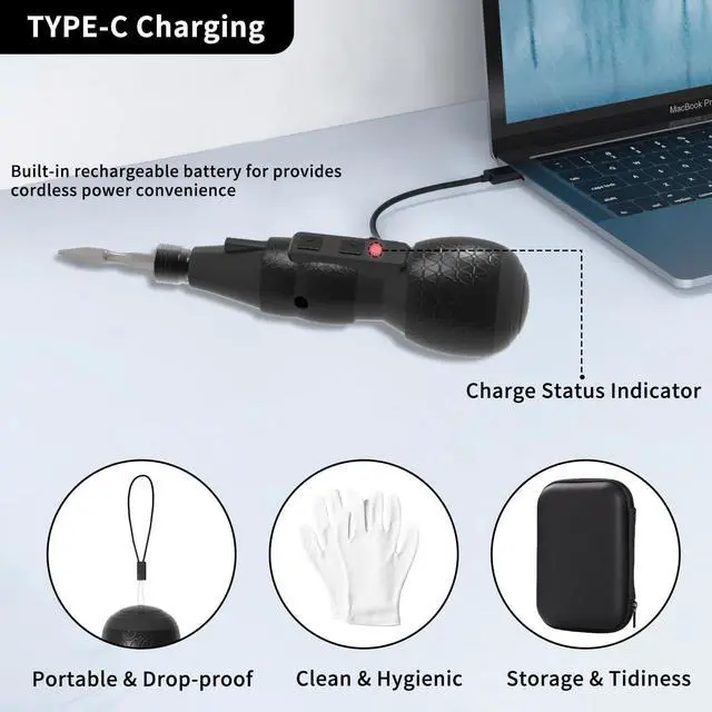 Complete Accessories: Electric screwdriver kit includes velectric screwdriver USB charging cable gloves a long drill bit a magnetic extension rod 12 magnetic short drill bits 10 screws a user manual and a storage case meet different needs.