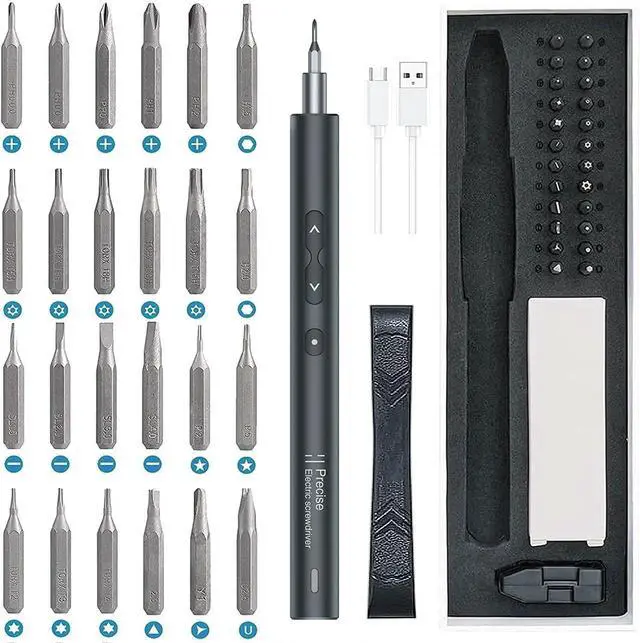 Electric Screwdriver 28 in 1: This power automatic cordless Torque screwdriver tool includes 28 units: 24 precision specialty bits 1 electric screwdriver handle 1 plastic prying tool 1magnetizer 1