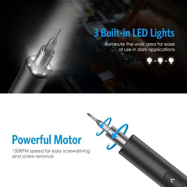 Lights Design: This Mini Electrical Screwdriver kit Embedded 3 LED Working Light which will brighten the working environment and allow you to work in the darkness ensuring a high working efficiency
