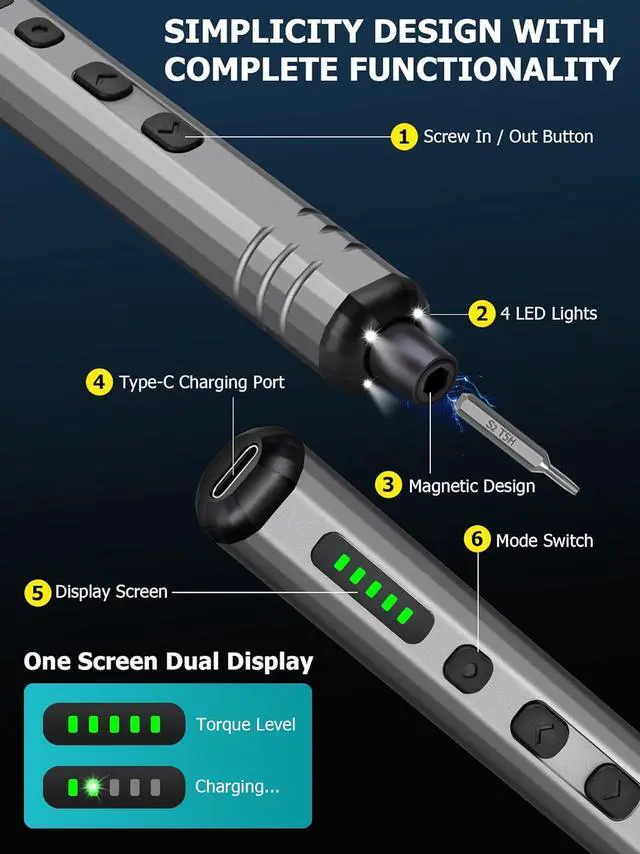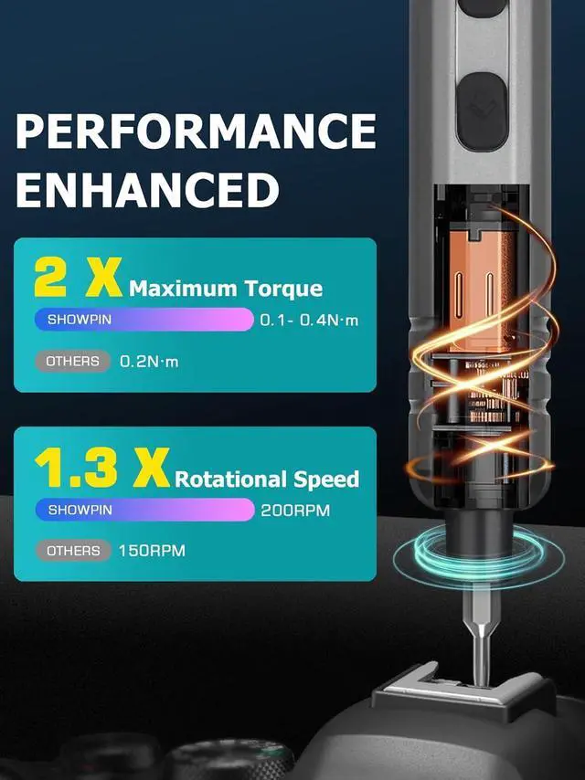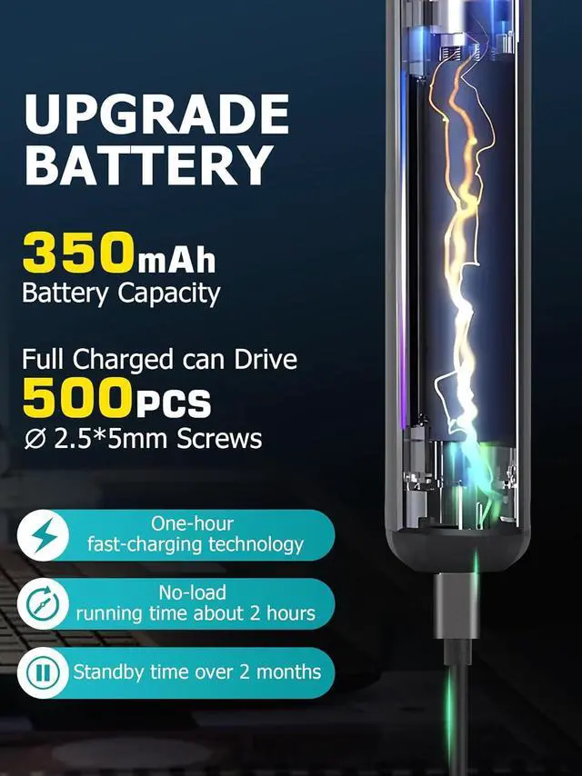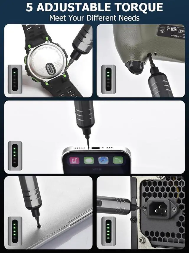 [Precision Project Repair Only] The motor can be set to 5 torque settings and maintain 200RPM power to work on different precision electronics. From glasses and watches with low torque needs to drones laptop rc computer and cameras with higher torque needs. [Long Lasting & Fast Charging] The 350mAh rechargeable battery delivers a long-lasting and stable battery life and can repair up to 500 screws under full charge. It is equipped with Type-C integrated fast charging technology fully charged in just 1 hour. The power supply ensures that you can stay focused on your repair projects and avoid interruptions due to insufficient power.