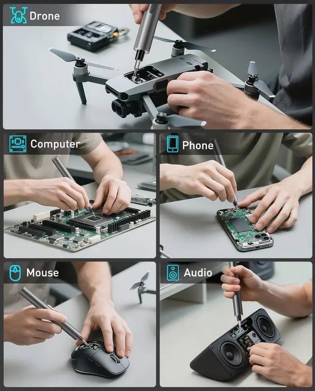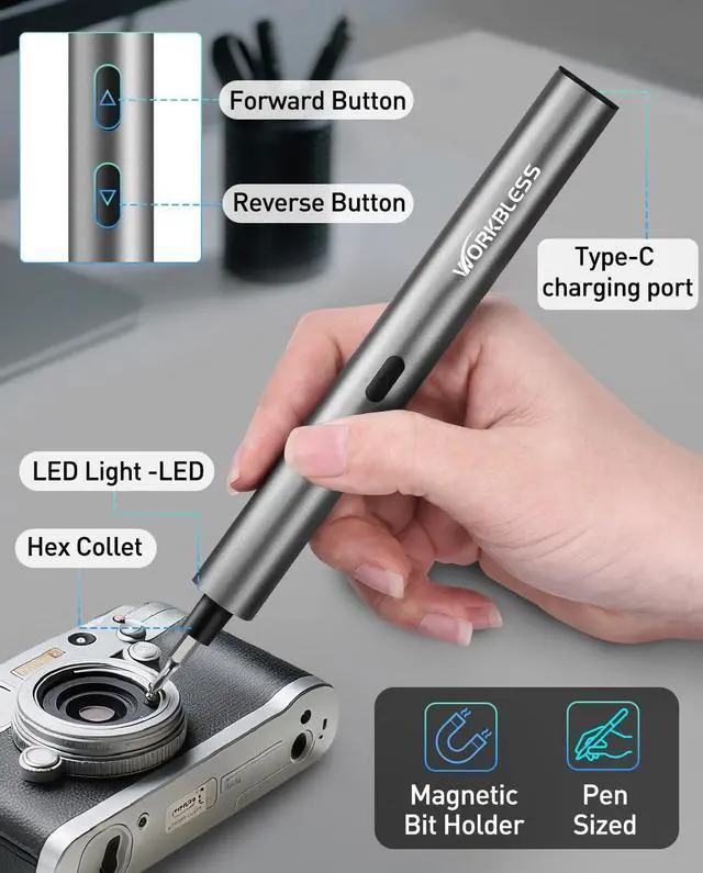 Precise Control & Dual-Mode SwitchingOne-touch operation allows for both electric (Max torque 0.2 N·m) and manual (Max torque 3 N·m) modes making it easy to remove delicate micro screws or increase torque for tougher jobs. Suitable for repairing electronics watches phones and DIY projects. Durable & Fast ChargingEquipped with a 350mAh rechargeable battery it delivers up to 3 hours of continuous use at 170 RPM and can remove over 500 screws on a single charge. USB-C fast charging takes just 2 hours. Precision Drill Bit Set Includes 24 High hardness and durable CRV steel drill bits (W 1.5 P2 P5 T2 T3 T4 H 1.5 H2 H 2.5? 2.3? 3 T5H T6H T8H T9H T10H PH000 PH00 PH0 PH1 Y 0.6 Y1 SL 1.5 SL2) to meet a variety of DIY and repair needs.