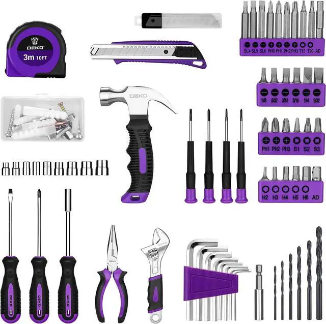 Tool Kit for WomenThis cordless drill combo kit are made of alloy steel chrome plated to prevent corrosion grip is anti-skid and comfortable. It is a good tool sets for women to do general DIY. Multi-functional Tool Set with DrillThis tool set contains the most practical and advanced tools for design repair or maintenance. This red tool box is perfect for decoration furniture assembly drilling cutting gardening office or daily home maintenance. Package Included8V Cordless Drill hex nut screwdriver Screwdriver precision Screwdriver twisted drills hex key magneitc bits holder 50L bits 25I bits 1/4 sockets Measure Tape Ruler fasteners claw hammer adjustable wrench Utility Knife Blade Utility knife Long Nose Pilers User Manual 1 Year Warranty.