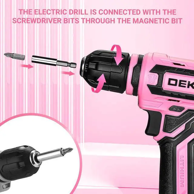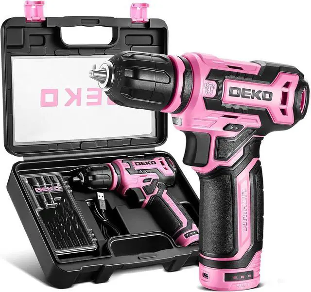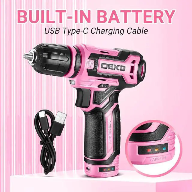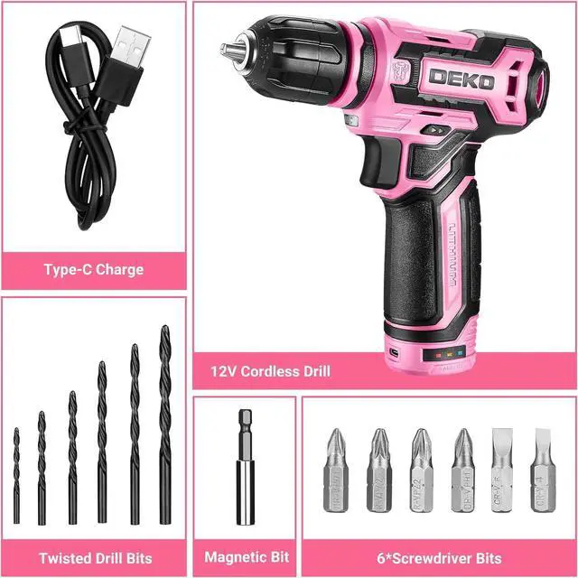 Multi-function Cordless Drill The 12 V Cordless Drill with LED Light -Get the job done with ease and precision. Suitable for drilling in wood and plastic and also for tightening/loosening screws. Built-in LED light for improved visibility in dark areas. This cordless drill is perfect for DIY projects and home maintenanceBe a Handy Women The net weight of the pink drill is only 1.65 pounds you can easily operate it with one hand. Its ergonomic design allows for easy handling and maneuverability making your drilling tasks comfortable and effortless. It is a very suitable drill set for women to do general DIYHigh-Performance Power Drill SetThis cordless drill offers a maximum no-load speed of 800 r/min providing fast and efficient drilling performance.