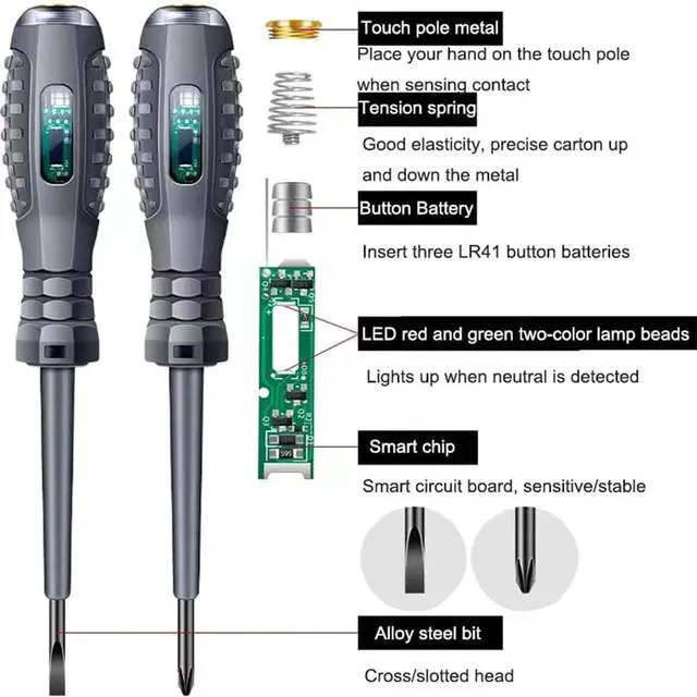 Two specifications: Straight and cross screwdriver with a magnetic design on the head which can adsorb screws and small metal parts improving work efficiencyNeon Light DisplayMagnetic Screwdriver Head When the pen detects voltage the neon light of the circuit pen lights up; the higher the voltage the brighter the neon light High-Brightness Color Light Tester Screwdriver The neon tube display in the voltage tester screwdriver lights up when voltage is detected. The brightness of the neon light increases with higher voltage levels providing clear visual feedback for safe operation. This electric pen contacts the contact rod if the inner core of the wire is not damaged the green light will light up; if it is off the inner core of the wire is in poor contactUsage MethodWhen using the voltage testing probe the screwdriver must be inserted at the bottom before testing and your finger should be fixed at the end of the handle. When voltage is present the neon tube will light up and operate safely Multi Electrical Tools Zero / live wire determination line breaking point judgment electrical switch detection non-contact voltage sensing voltage detector pen can accurately detect voltage effectively preventing the risk of electric shock
