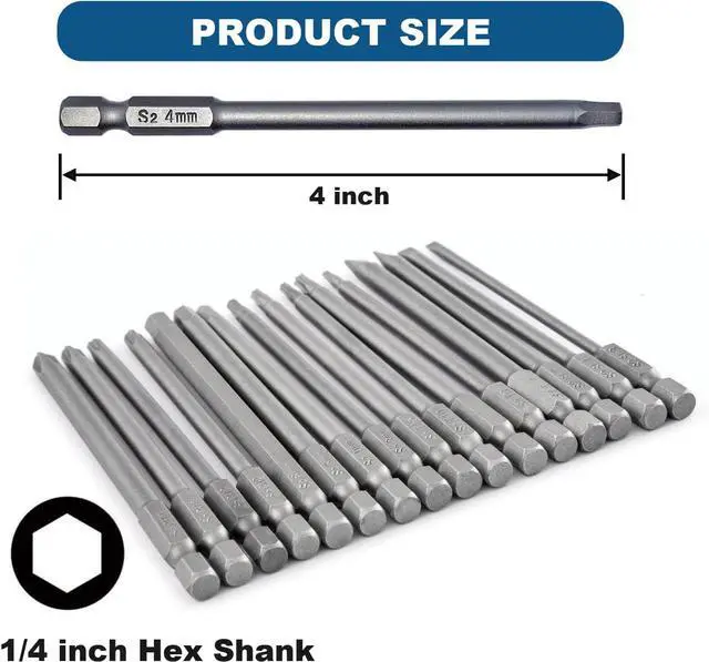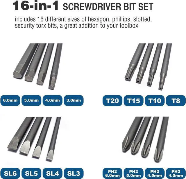 PREMUIM MATERIAL - The screwdriver bits are made of high quality S2 steel high hardness wear resistance and impact resistance the surface adopts sandblasting process reliable for long time service. VERSATILE BITS - Include 16 screwdriver bits HEX H3 H4 H5 H6 Slotted SL3 SL4 SL5 SL6 Torx T8 T10 T15 T20 Phillips PH2*4 PH2* 4.5 PH2*5 PH2*6 competent for various working conditions. STRONG MEGNETIC - Easy to hold the screws convenient to use in multiple work scenarios especially in tight space clearly engraved marks for identification. HIGH PRECISION - The precision is strictly controlled in production process perfectly fits the screws prevents slipping or shuttering the bits are straight and concentric effectively reducing the bits wobble.