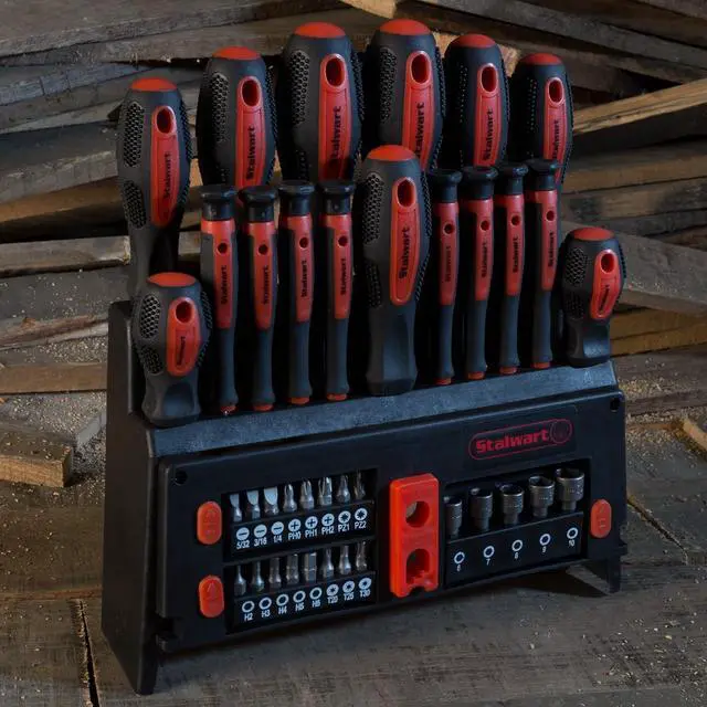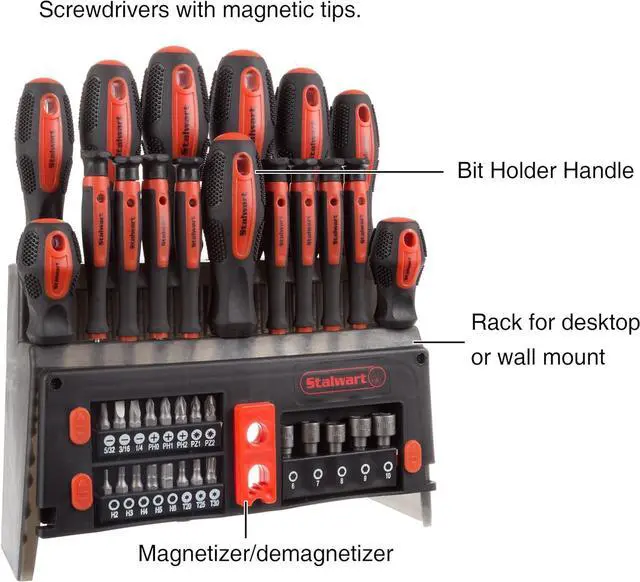 39 PC SCREW DRIVERS TOOL SET - This Stalwart tool set features magnetic tips chrome Vanadium steel blades and a satin finish for ultimate precision control and comfort. They are ideal for home improvement or working on your car truck boat or RV. SCREWDRIVERS WITH RACK - This set includes slotted screwdrivers (1/4 x 1.5 3/16 x 3 1/4 x 4 5/16 x 6) and Phillips screwdrivers (#2 1.5 #1 x 3 #2 x 4 #3 x 6). Everything fits on the rack which comes with a magnetizer/demagnetizer. INCLUDES PRECISION SCREWDRIVER SET - This home tool kit comes with 8 precision screwdrivers including #00x2 and # 0.2 Phillips screwdrivers 2.0 x2 2.5 x2 and 3x2 slot screwdrivers as well as T6x2 T8x2 and T10x2 star screwdrivers.