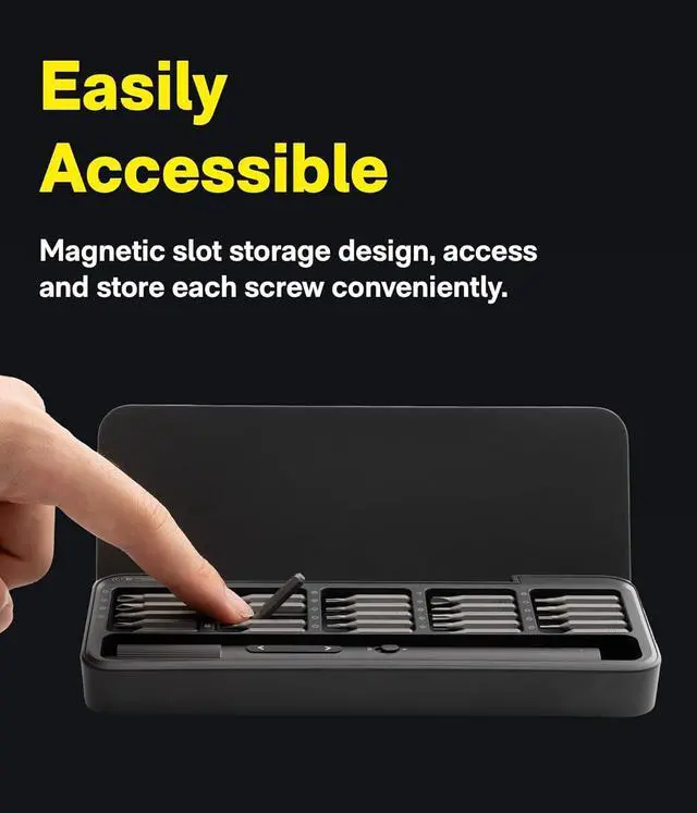 The automatic 360° LED light illuminates your workspace making every screw clearly visible. No more guessing or straining your eyeslike having a third eye for your repair projectsMagnetic Bit Storage Box The strong magnetic case keeps all bits securely in place. Easily swap bits in seconds and keep your workstation tidy. Perfect for professionals who value both speed and organizationErgonomic & Comfortable Grip The anti-slip texture and coating ensure a firm comfortable hold. Designed to reduce fatigue during long tasks this mini screwdriver set delivers a stable effortless repair experience in every detail