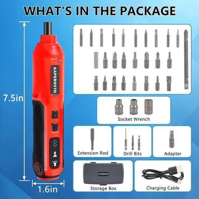 Widely used in assembling furniture installing switches repairing electrical appliances replacing mechanical equipment parts DIY projects etcLightweight & ErgonomicComfortable for All Users with non-slip gripErgonomic design fits all hand sizes comfortably Ergonomic design fits all hand sizes - from teens to adults. Built-in LED light for dark spaces (under sinks car engines). Full set of accessoriesElectric Screwdriver Kit including 34 screwdriver bits 1 adapter rod 1 drill bit 3 sleeves 1 Type-C USB charging cable 1 toolbox. The tool box set can meet all your family needs