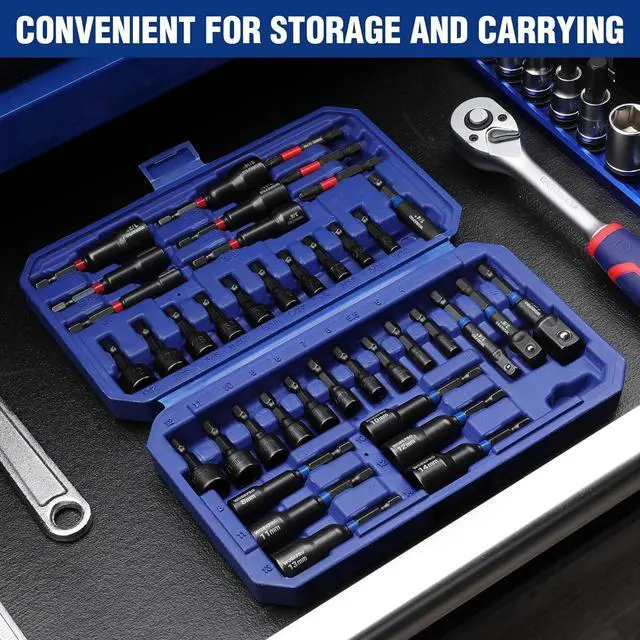 Reasonable Set: WORKPRO 39 PCS magnetic nut driver set contains 6 PCS 65mm metric magnetic nut driver (8mm 10mm 11mm 12mm 13mm 14mm) 6 PCS 65mm SAE magnetic nut driver(1/4'' 5/16'' 3/8'' 7/16'' 1/2'' 9/16'') 3 PCS impact socket adapter(1/4'' 3/8'' 1/2'') 10 PCS 38mm metric nut driver(4mm 5mm 5.5 mm 6mm 7mm 8mm 9mm 10mm 11mm 12mm) 10 PCS 38mm SAE nut driver(5/32'' 3/16'' 7/32'' 1/4'' 9/32'' 5/16'' 11/32'' 3/8'' 7/16'' 1/2') 1PCS Magnetic Bit Holder and 3PCS Screwdriver Bit (PH2). One set is enough for allPremium