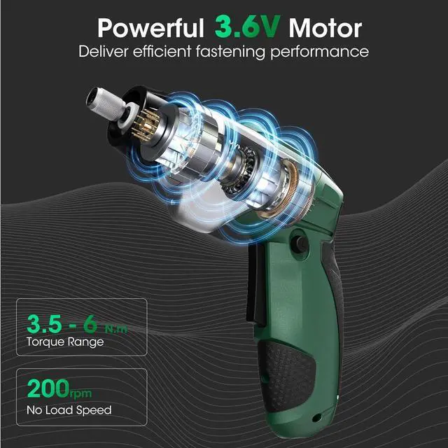 POWER SUPPORT: Cordless electric screwdriver is equipped with a 3.6V motor supporting a torque range adjustment from 3.5 to 6 N. m offering 7 levels of torque settings. No-load speed can reach up to 200rpm. Whether furniture assembly or industrial equipment maintenance power screw gun can provide power support and easily handle various fastening operationsEASY