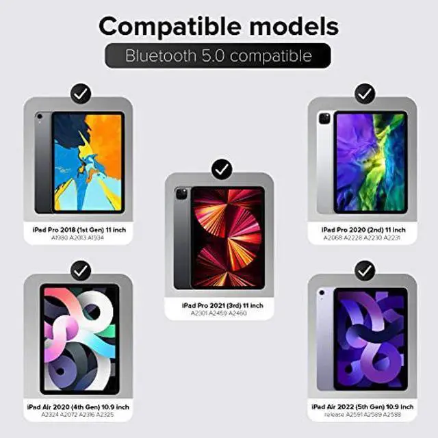 Our top-of-the-line keyboard case, designed specifically for the 10.9-inch iPad Air 5th generation (2022), iPad Air 4th generation (2020), and the 11-inch iPad Pro 4th generation (2022), iPad Pro 3rd generation (2021), iPad Pro 2nd generation (2020), and iPad Pro 1st generation (2020). including specific models such as A2759, A2435, A2761, A2762, A2301, A2459, A2460, A2228, A2068, A2230, A2231, A1980, A2013, A1934, A1979, A2072, A2316, A2324, A2325.