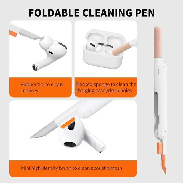 Earphones/Airpods: Mini foldable cleaning pen with a sponge stick rubber tip and high-density brush a great idea for cleaning Bluetooth earphones Airpod Pro 1 2 and other earbuds and earbuds charge cases. The high-density brushe and rubber tip can easily cleaning the dust sticks on acoustic mesh shallow holes and crevices. Use the flocked sponge to clean the charging case and some deep holes that we can't reach. Charging Port and