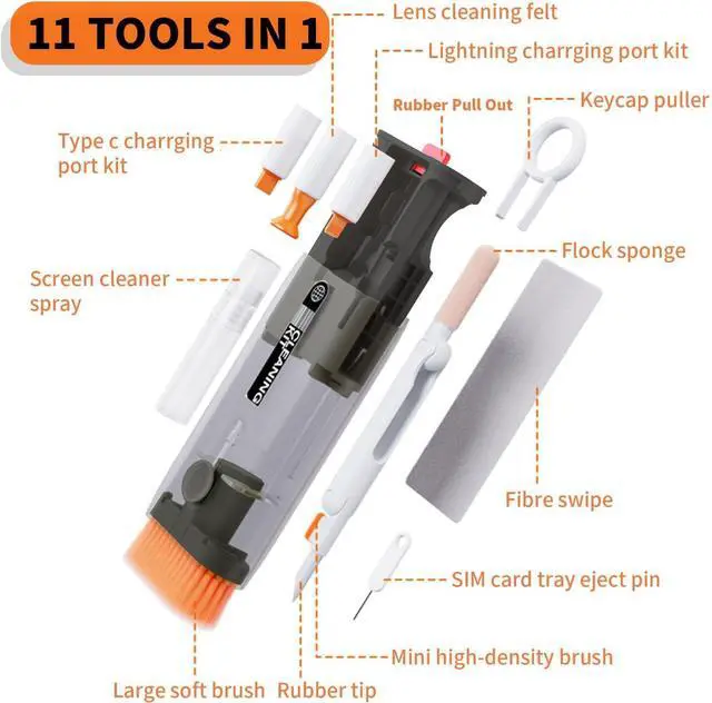 All Electronics Cleaning: The upgraded electronics cleaner set comes with most cleaning tools to effectively deep clean all your electronic devices. It includes retractable high-density brush earphone cleaning pen(including flocking sponge rubber tip and mini high-density brush) type c charging port cleaning kit lightning charging port cleaning kit lens cleaning felt sim card tray eject pin keycap puller fibre fleece swipe and screen cleaner spray. Large Brush Fibre Fleece Swipe and Cleaner Mist for