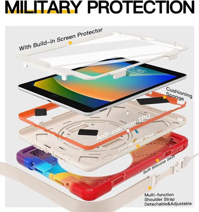 360° Swiveling Stand & Hand Strap Located on the back of iPad 9th/8th generation 10.2 Inch shockproof case 2021/2020, built-in 360 degree rotating kickstand and adjustable handle hand strap provides a more flexible and convenient way to use your tablet during work, study or journey, ideal for students,teachers,engineers,cashiers and waiters,etc.