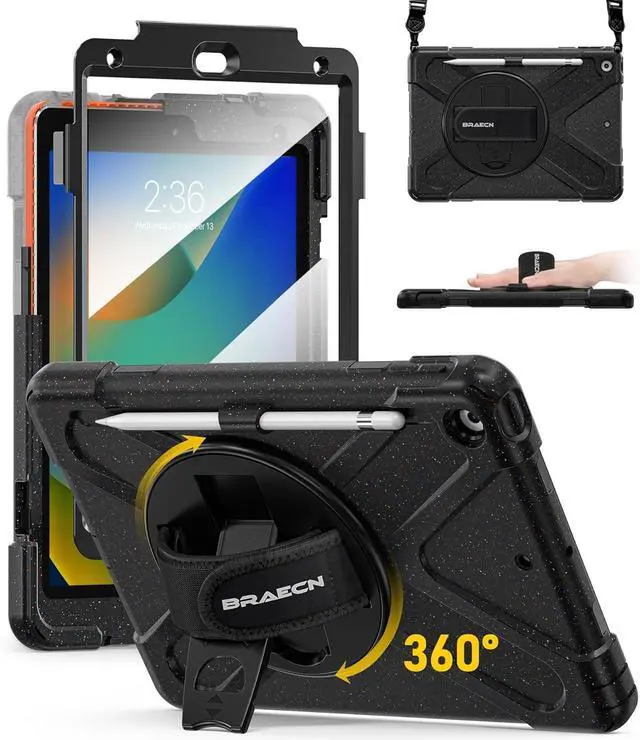 [360°Rotating Anti-Slip Hand Strap; Stand with One-Touch Retract Button]With the rotating system as well as kickstand and Silicone handle, it makes this multi-functional case that you can use in any scenario, such as commuting, office, study, watching videos, typing. In addition, the detachable and adjustable shoulder strap can help you carry it easily, and you can also hang it on your car seat to use your tablet.