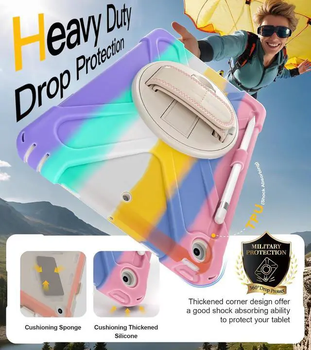 [360°Rotating Anti-Slip Hand Strap; Stand with One-Touch Retract Button]With the rotating system as well as kickstand and Silicone handle, it makes this multi-functional case that you can use in any scenario, such as commuting, office, study, watching videos, typing. In addition, the detachable and adjustable shoulder strap can help you carry it easily, and you can also hang it on your car seat to use your tablet.