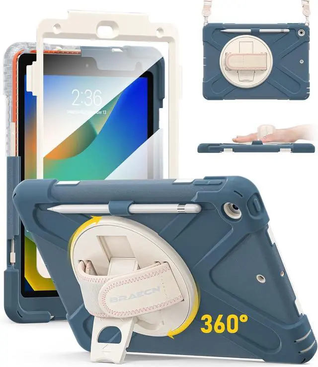 for iPad 9th/8th/7th Generation Case,Heavy Duty Shockproof Case with Screen Protector, Pencil Holder, Pencil Cap Holder, Hand Strap, Kickstand,Shoulder Strap for iPad 10.2 Inch 2021/2020/2019