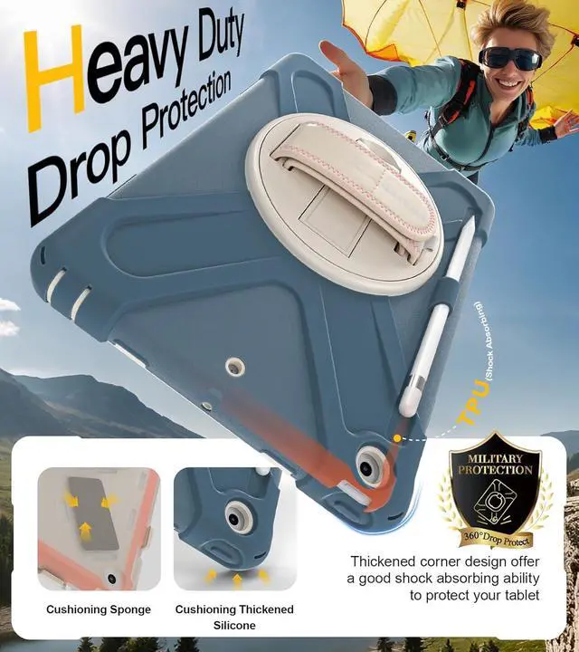 360° Swiveling Stand & Hand Strap Located on the back of iPad 9th/8th generation 10.2 Inch shockproof case 2021/2020, built-in 360 degree rotating kickstand and adjustable handle hand strap provides a more flexible and convenient way to use your tablet during work, study or journey, ideal for students,teachers,engineers,cashiers and waiters,etc.