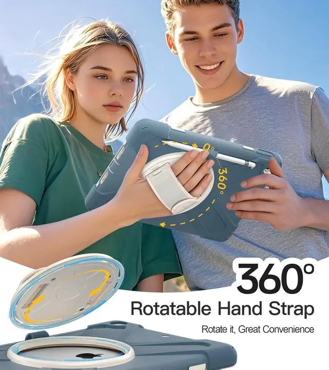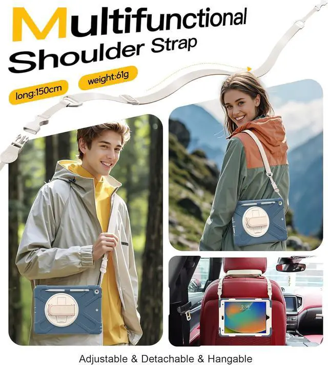 Adjustable & Detachable Carrying Strap Portable Shoulder Strap allows to carry your iPad in landscape/portrait mode securely in outdoors or hang your iPad in kitchen,bedroom,car seat for convenient usage.