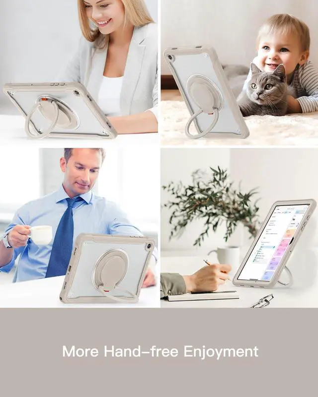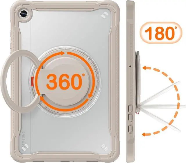 360°Rotating/180°Folding Mul-tifunction Kickstand Rotatable kickstand can set up multiple angles, offering a perfectly convenient use experience for film watching, working and typing. The stand provides stabilizing support on various surfaces. A small elastic ring on the kickstand helps hold the pencil in place for easy access.Importantly, the Improved ring surface design makes it easy to operate,even for the kid.