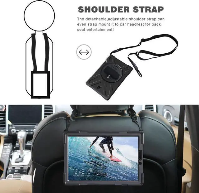Flexible Nylon Shoulder Strap: With the attachable shoulder strap,your tablet can be carried vertivally or horizontally in a more secure way during hiking, traveling or other outdoor activities. Also allows you to hang up your tablet behind car seat for iPad entertainment for kids