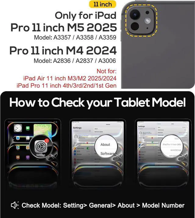[Compatibility]:This protective case is designed exclusively for iPad Pro 11 inch (M5) 2025 &(M4) 2024, compatible with models A3357, A3358, A3359 & A2836, A2837, A3006. It is not compatible with other iPad generations.Please confirm your devices model number before purchasing to ensure proper fit.Confirm compatibility under Settings > General > Model