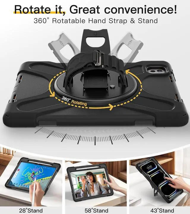 [360°Rotating Anti-Slip Hand Strap; Stand with One-Touch Retract Button]With the rotating system as well as kickstand and Silicone handle, it makes this multi-functional case that you can use in any scenario, such as commuting, office, study, watching videos, typing. In addition, the detachable and adjustable shoulder strap can help you carry it easily, and you can also hang it on your car seat to use your tablet.