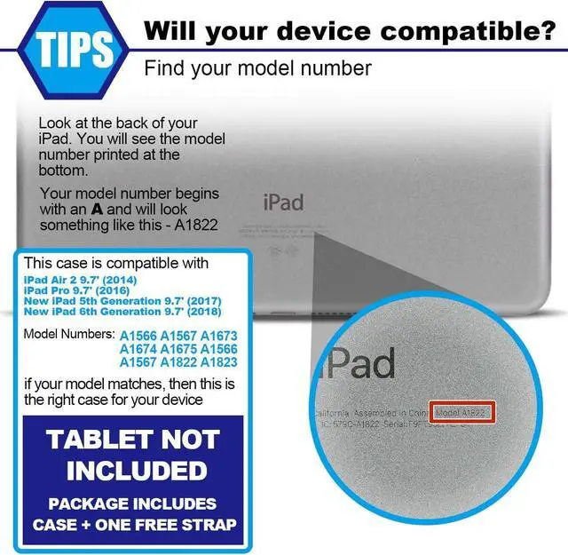 • Compatibility: Case for iPad 6th Generation 9.7 inch 2018 ( A1893 / A1954 ), for iPad 5th Generation 9.7 inch 2017 ( A1822 / A1823 ), for iPad Air 2 ( A1566 / A1567 ) and fit for iPad Pro 9.7 inch ( A1673 / A1674 / A1675 )
